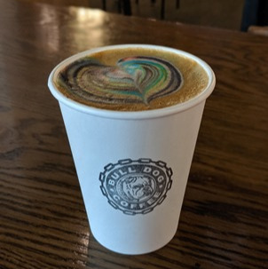 We found a spot to sit down and relax with our drinks and i VERY SLOWLY tried to open the lid as to not ruin the latte art rainbow heart...